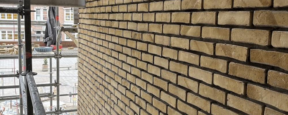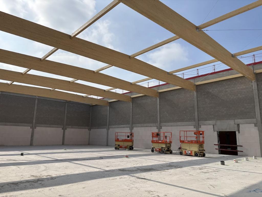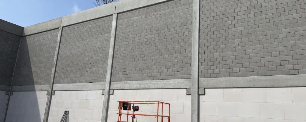 Gebouw G: gevelbekleding afgewerkt en metselwerk/dakstructuur sporthal / Gebouw C: ruwbouw afgewerkt en opstart facademetselwerk