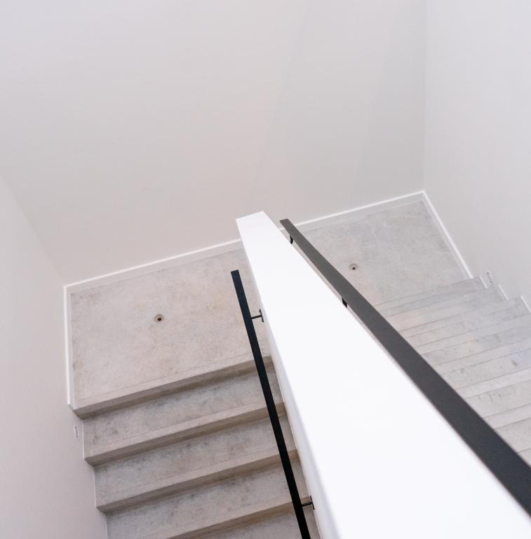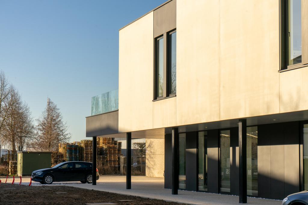 De compacte vormgeving en materiaalkeuze - een combinatie van beton, zwart plaatmateriaal en zwart buitenschrijnwerk in aluminium - bepalen de industriële architectuur van het nieuwe volume dat tegen de bestaande loods werd gebouwd. De hoogwaardige materialen in de inkomhal met onthaal en vergaderzaal zorgen dan weer voor een warme, huiselijke sfeer. Verder omvat de gelijkvloerse verdieping een landschapskantoor, een wachtruimte voor de ploegen, een sas met directe toegang tot de achterliggende loods, een refter met uitgeruste keuken, toiletten, een berging, techniekenruimte en voorzieningen om te douchen.